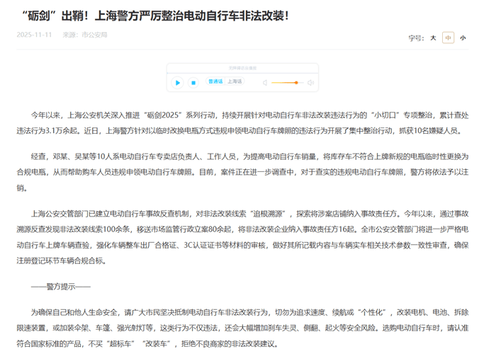 电动自行车非法改装会大幅增加行驶安全风险与车辆自燃、爆燃概率,严重危害道路交通安全。业内人士指出,改装不仅会改变整车重量,影响操控和制动性能,解除限速后的超速行驶还极易导致车辆失控引发交通事故;同时,电池改装后接线端子易受损,会加速电缆接线腐蚀断开,若随意搭接导线产生打火,还可能引燃电池充电时内部聚集的氢气引发爆炸;此外,电池改装必然改动原车电路,细电线承载大电流会导致电路不稳定,车辆在充电或行驶过程中容易出现短路,进而引发自燃。