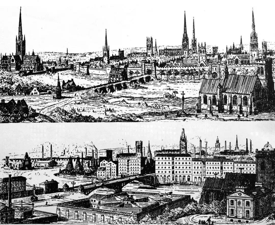 工业革命引发乡村人口向城市快速集聚,城市的发展和人口的集聚相继受到了以蒸汽机发明使用等为代表的第一次工业革命(18世纪50年代至19世纪40年代)、电力发展和内燃机发明使用为代表的第二次工业革命(19世纪70年代至20世纪初)等科技发展的重大影响。工业时代的城市功能、城市结构、城市布局、交通组织、街区模式及建设科技较工业革命前发生了迭代性的变革,金融贸易、银行保险、证券交易,以及公共交通、工人居住区等均成为新的城市功能。1801—1851年,伦敦城市人口从100万增加到了200万,但受交通方式的限制,城市面积只增加了很少一部分,结果导致城市新移民的居住空间和生活环境极度拥挤、传染病盛行,引发公共卫生安全危机。现代城市规划缘起的重要原因之一就是要探寻并谋求城市公共卫生问题的科学解决方案。