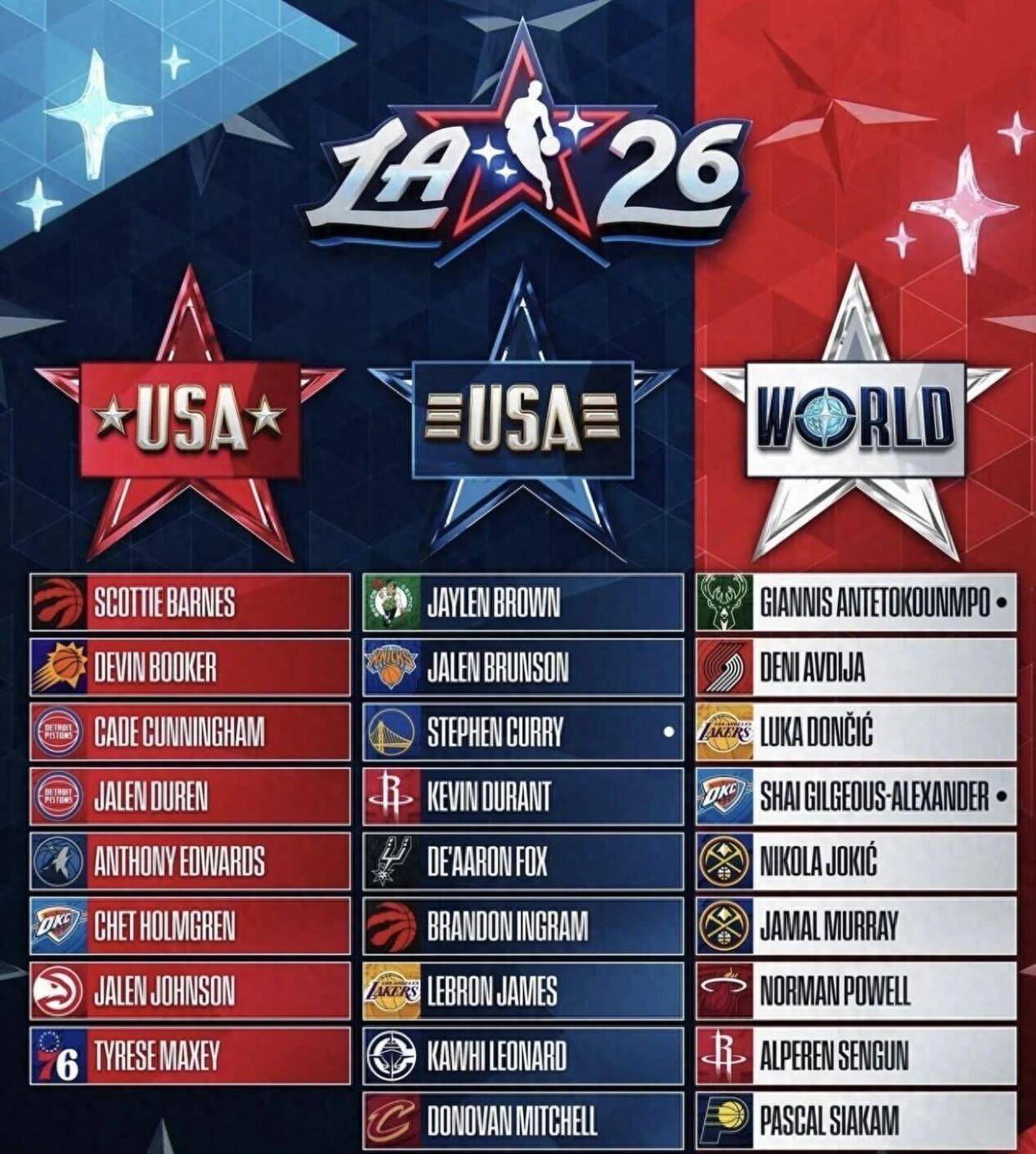 联盟彻底抛弃了沿用多年的东西部对抗模式,首次采用了“美国队对阵世界队”的三方混战结构。 24名全明星被分为三支队伍:两支由美国本土球员组成的队伍——以年轻球员为主的“美国星辰队”和以老将为核心的“美国条纹队”,以及一支由非美籍国际球星组成的“世界队”。 比赛流程也焕然一新:三支队伍先进行单循环对决,每场比赛仅打12分钟,战绩最好的前两名晋级最后的冠军决赛。 如果出现三队战绩相同,则依靠净胜分来决定命运。